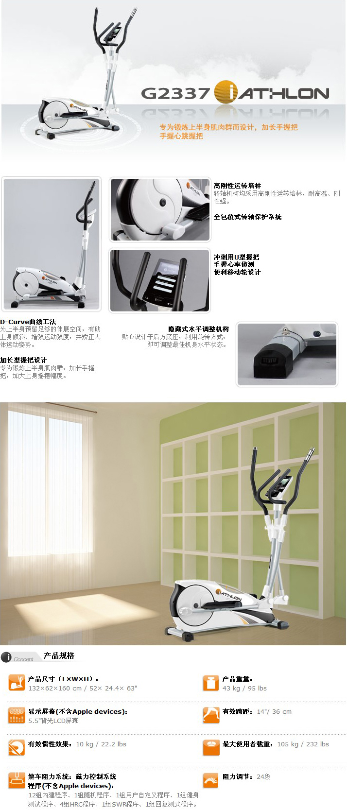 12組內(nèi)建程序、1組隨即程序、1組用戶自定義程序、1組健身測試程序、4組HRC程序、1組SWR程序、1組回復(fù)測試程序 |